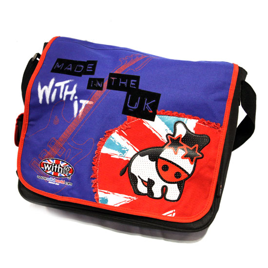 Featured here is a kids' cross body bag designed by Withit, a UK brand producing gift items. It comes with attractive graphics of a comical cow with star-shaped sunglasses. Patterns of a guitar and the flag of the UK are also added for extra detail.
