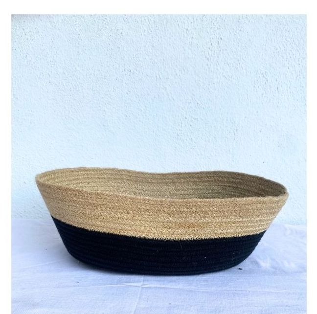 This handcrafted boat-shaped centerpiece, made from cord, features a beige design with a black border, perfect for holding fruit.