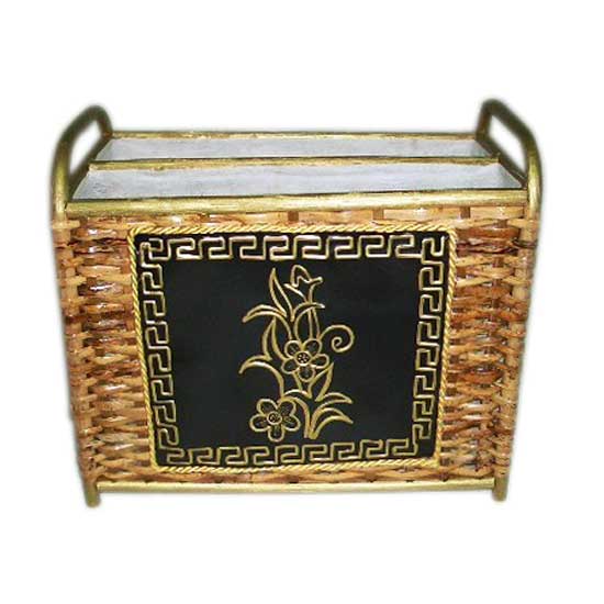This rectangular magazine basket features a rattan construction with a two-compartment design. It comes with an etched tin plate with floral patterns and polished metal hardware. The magazine basket serves to hold your magazines in place.