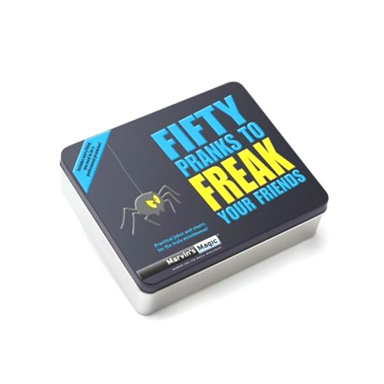 This "Fifty Pranks to Freak Your Friends" magic set is nicely packaged in a tin box. It includes everything you need to be a professional prankster. The pranks are practical jokes and stunts for the truly mischievous.