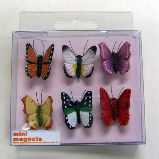 Shown here is a set of 6 mini magnets with a butterfly design. The butterflies are crafted with fine details and painted in fantastic colors. These magnets decorate your fridge with style.