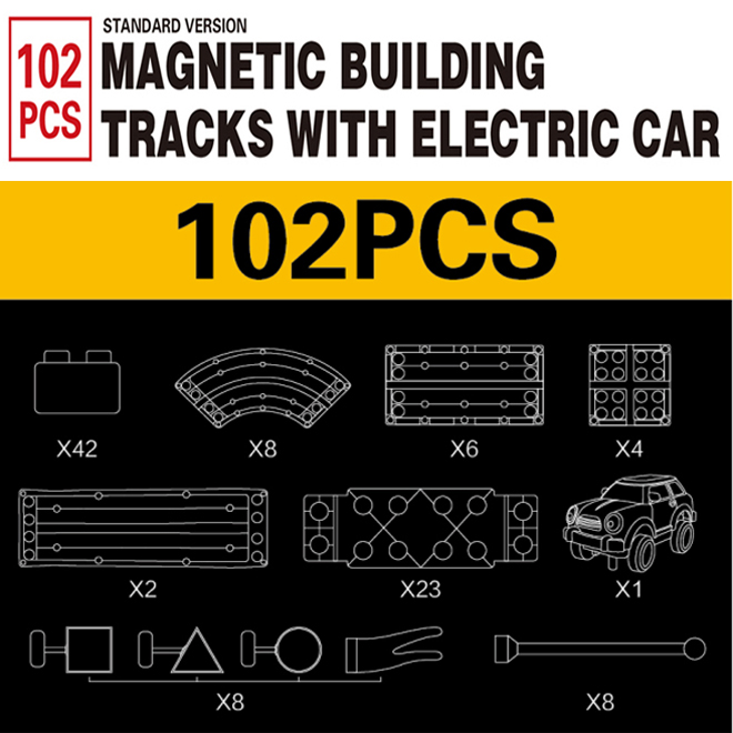 REMARK: The magnetic tiles has super magnetism, reliable splicing, the unique groove design, combined with the guide column at the bottom of the car, makes the car travel stably without derailing.Electric car with light, using 1 AA battery (not included)