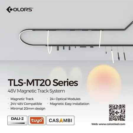 TLS-MT20 is a DC48V magnetic track system of 20mm width. Its magnetic design offers great DIY convenience to flexibly combine linear modules, spotlights, pendant lights and decorative neon flex in one system, achieving all your lighting demands like basic flood lighting, accent lighting or decorative lighting, suitable for residential villas, hotel clubs, entertainment venues or commercial exhibitions, etc.