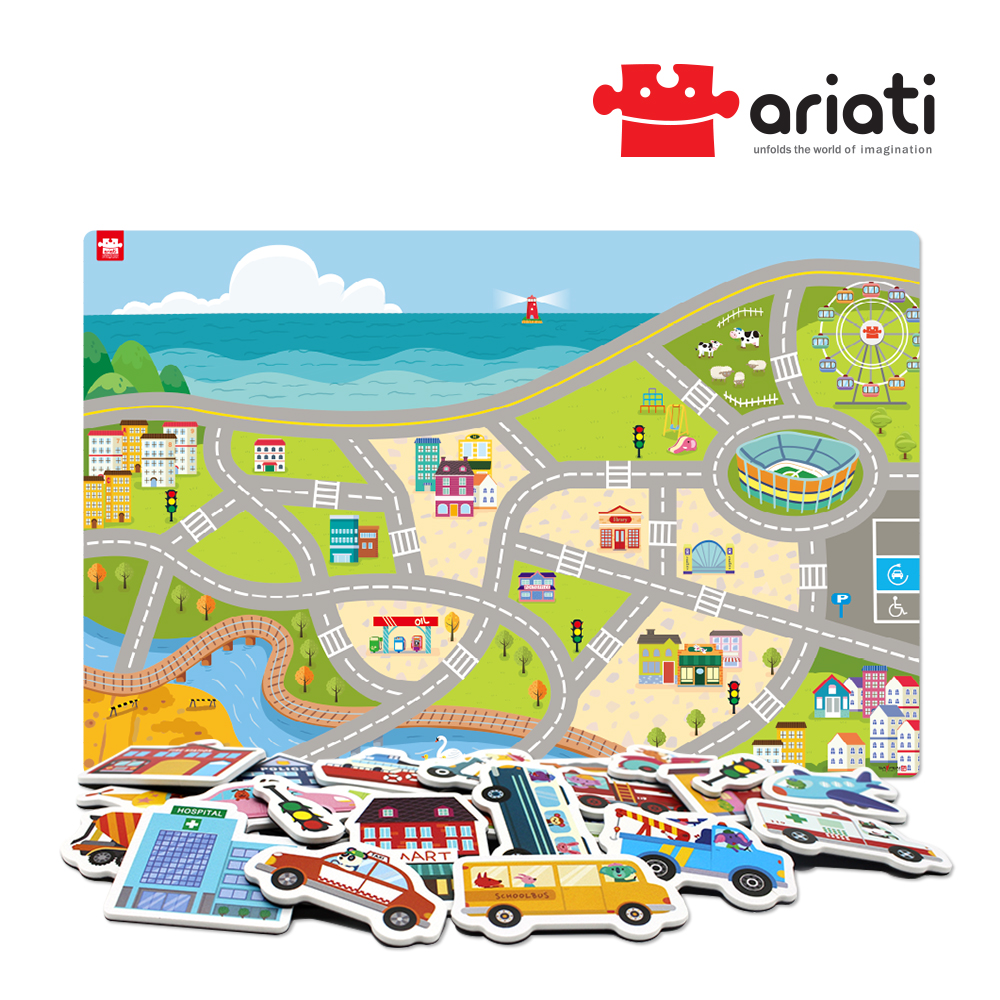 By sticking the poster which is made of steel-paper on the wall, and by using the small units of toys within the package, children will be able to tell their own stories. This product will help children's creativity, language skills and fine motor skills.