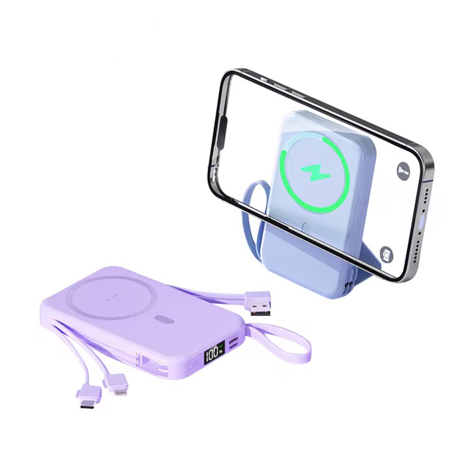 Magnetic Wireless Power Bank Slim Size 22.5W 10000mAh with Digital Display Hidden Bracket Built-in Cables Portable Hand Strap