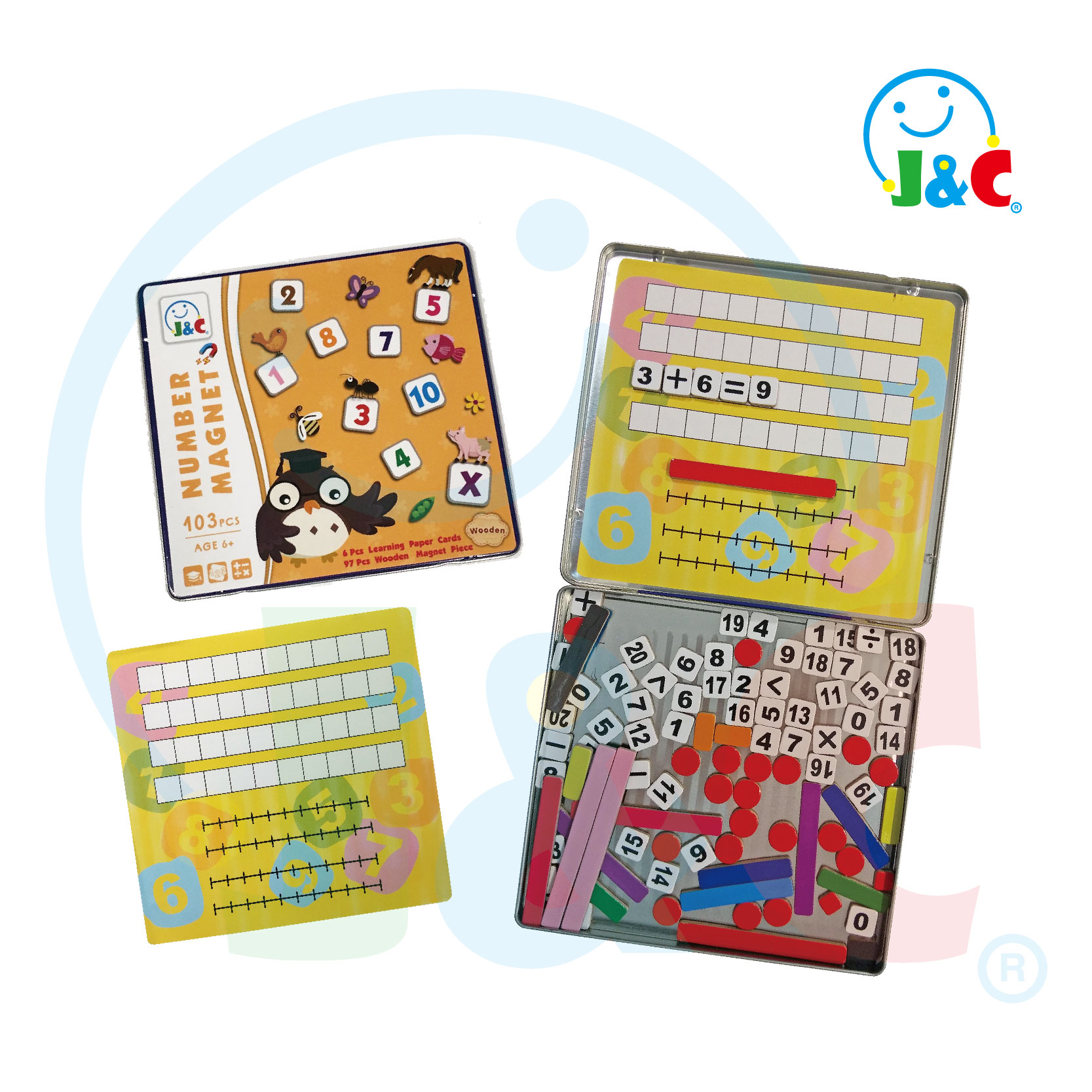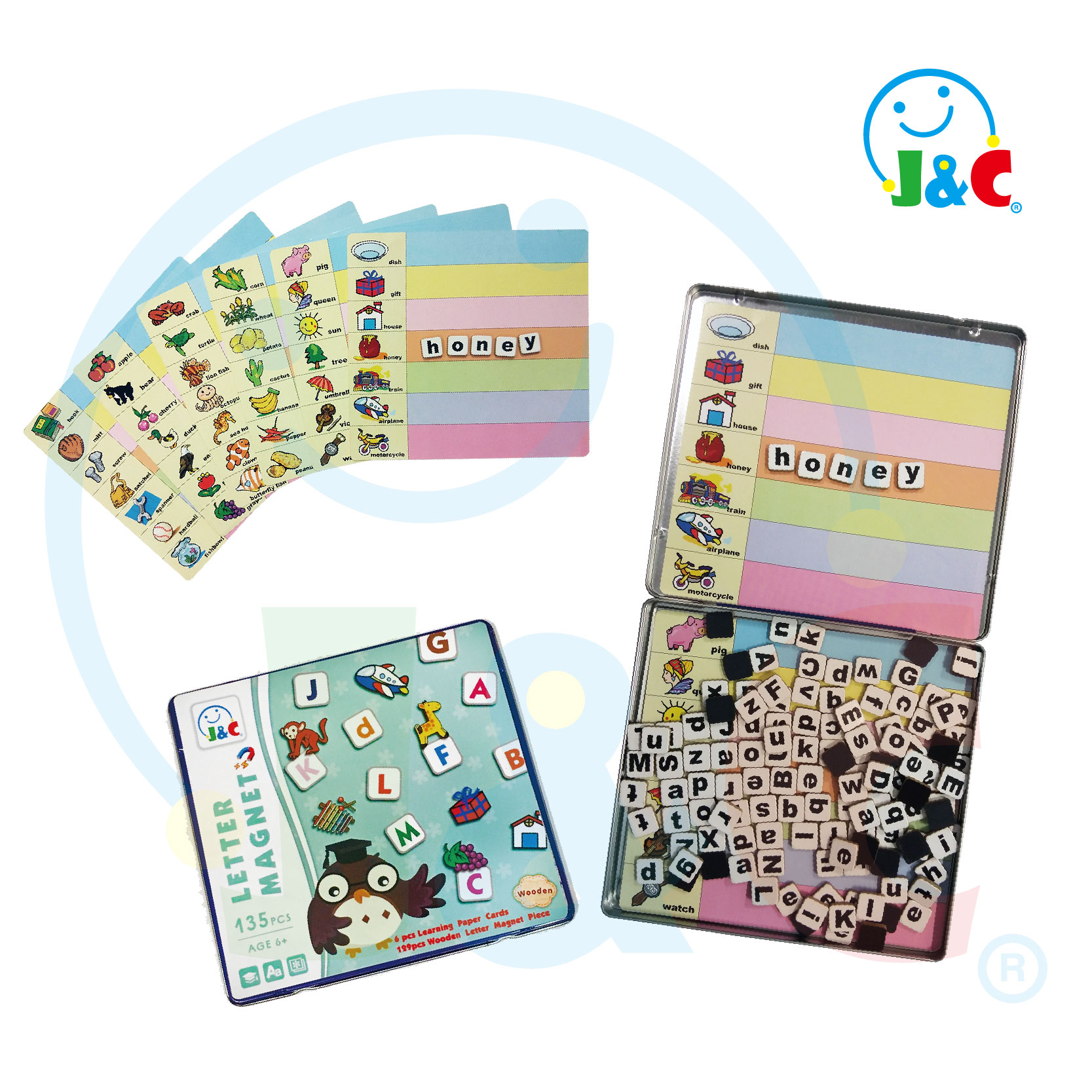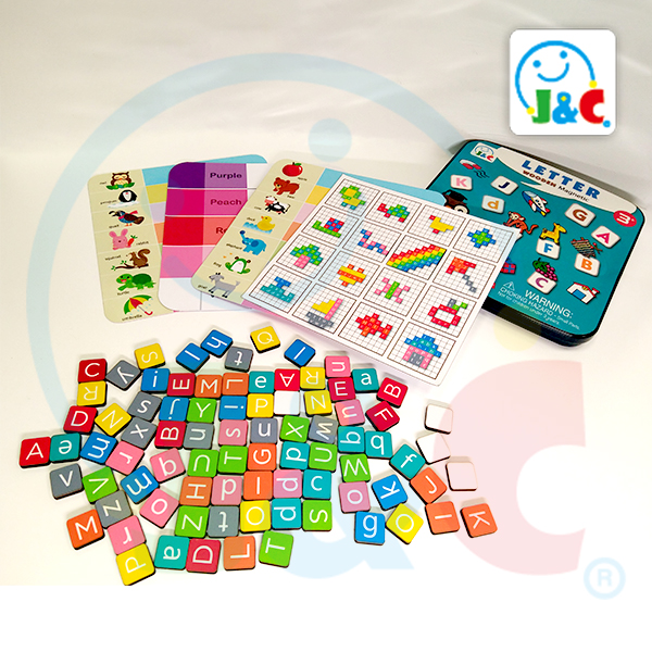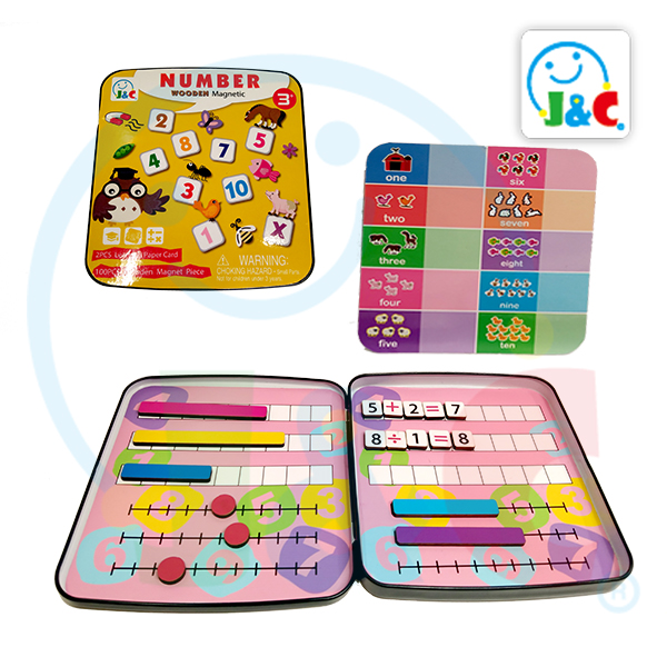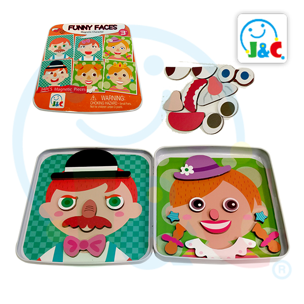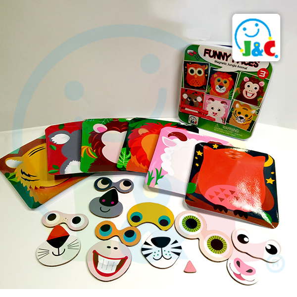 Magnetic educational game in wooden pieces for the faces theme, letters and numbers. Once the metal box is opened, the aim is to make on the stage the same face or counting or spelling as per the indicated cards. The kids can also create funny and crazy faces by mixing the different magnets together, or use the pieces of different color to create different patterns.