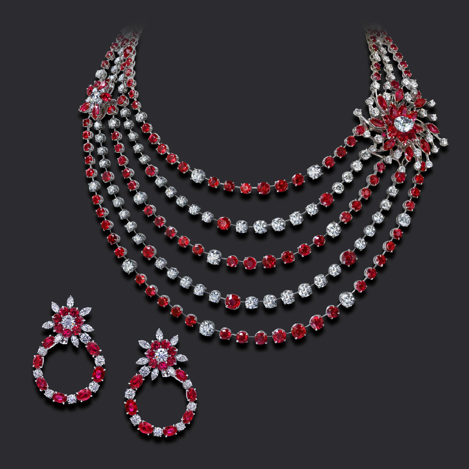 The necklace composed of five flexible rows of slightly graduated round Burmese rubies alternative with brilliant-cut diamonds, connected on a one side by removable brooch designed as a marquise and pear-shaped ruby and diamond cluster and from other side by small ruby and diamond cluster, ending on a back by three rows same design with round rubies and brilliant-cut diamonds in alternative setting, connected by ruby and diamond clasp, mounted in platinum. An Elegant Burmese Ruby and Diamond Earrings Designed as a twisted row of slightly graduated oval-shaped rubies alternative with brilliant-cut diamonds, to the flower ruby and diamond cluster top, mounted in platinum.