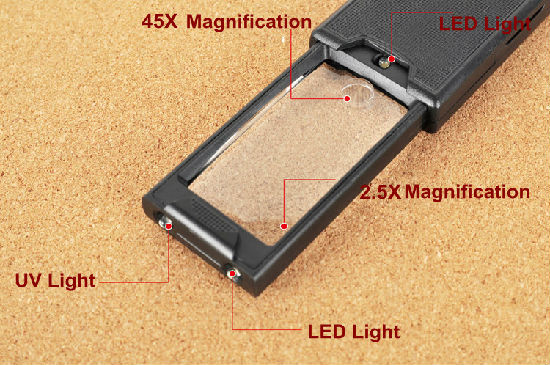 - Reading, jewellery evaluating, lighting and currency detecting etc. Small volume, easy to carry, unipue meshed skid-proof design for outer housing.