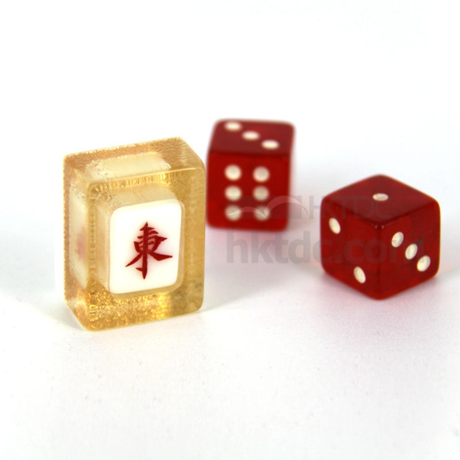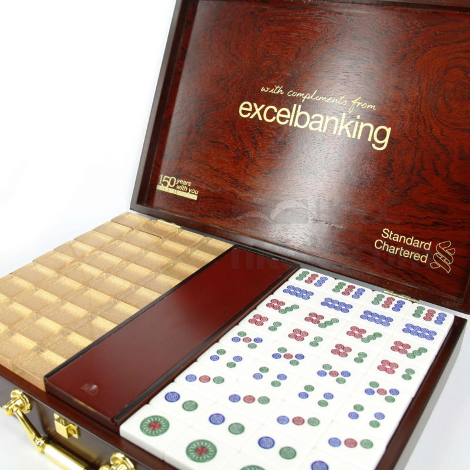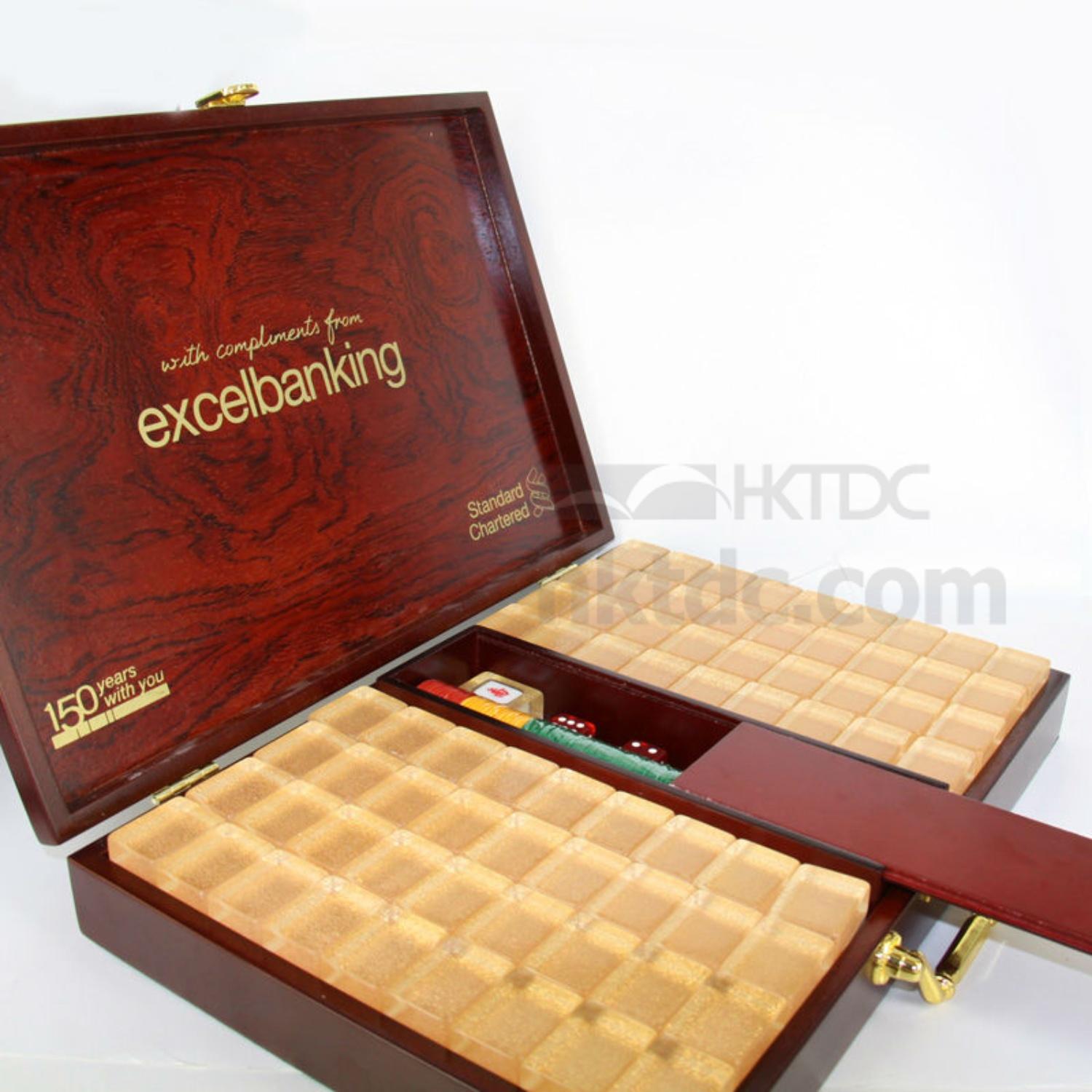 Displayed here is a set of mahjong tiles packed in a wooden box. The mahjong is a game of skill, strategy, and calculation and involves a degree of chance. This set of mahjong tiles is crafted of acrylic materials for a shimmering appearance and a durable construction.