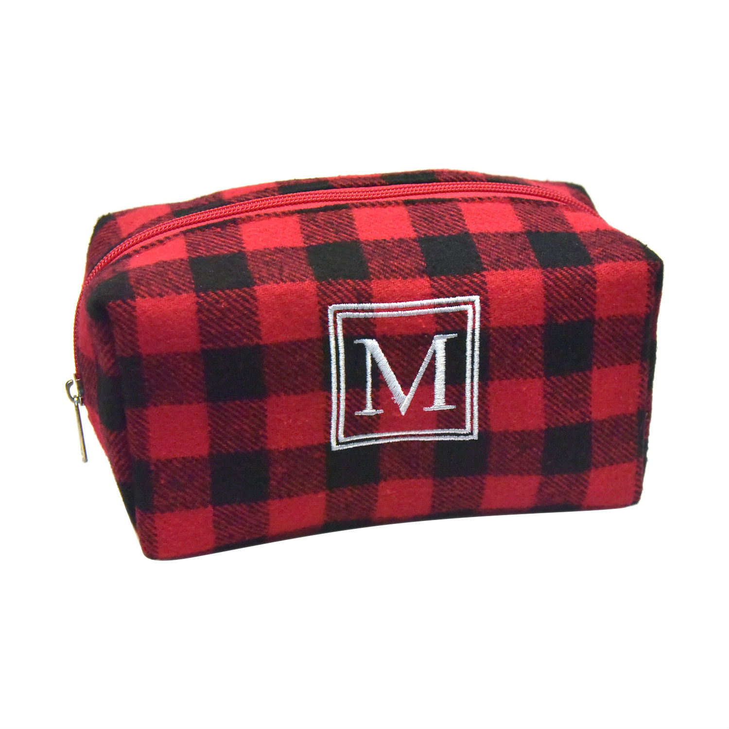 Highlighted here is a cosmetic bag made of cotton and polyester. It is rectangular shaped and is embellished with checkered patterns on the exterior. This cosmetic bag can easily fit inside your luggage and is great for travelling or everyday use.