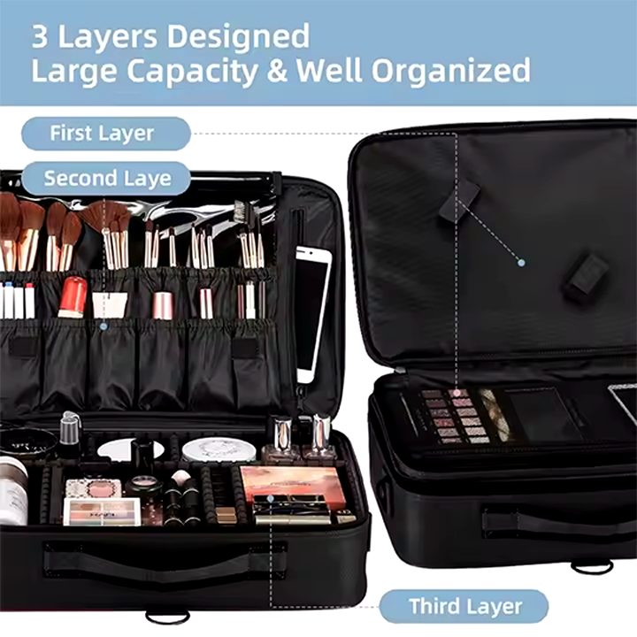 2.Made of sturdy poly, spacious with 3 layers. Features adjustable compartments. Waterproof, easy to clean. Stylish & portable, perfect for organizing cosmetics.