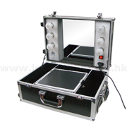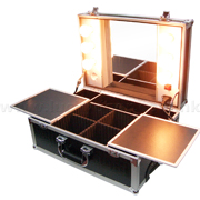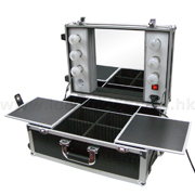 • Al-in-one train case with mirror and light bulbs at upper lid.