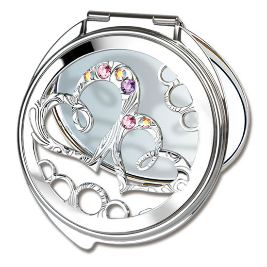 Keep this easily portable, crystal-accented folding mirror in your bag for checking your look on the go. It features two heart-shaped cutouts and colorful stones on the cover for a romantic flair. It is framed with a standard mirror for applying makeup touch-ups with ease.