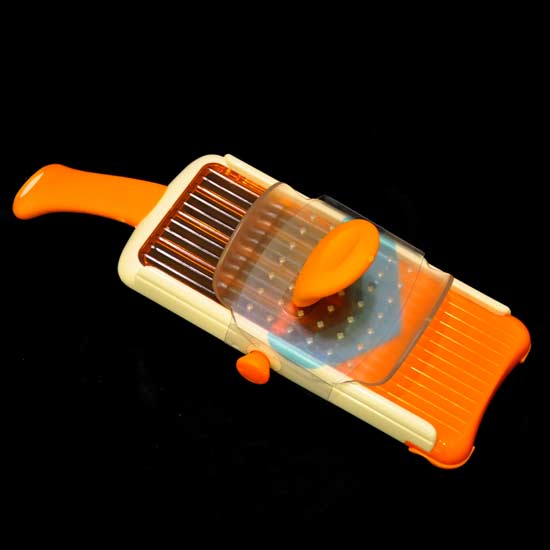 This mandoline slicer features an adjustable mechanism which is excellent for different kinds of food. The corner notch fits well over the bowl and keeps hands and fingers safe. Accessorize your home kitchen with this versatile and easy-to-use slicer.