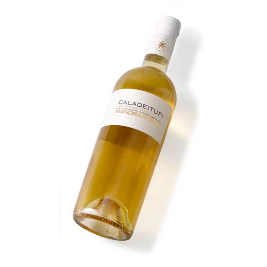 Displayed is a bottle of Mandrarosse that originates from Italy. With a tawny yellow color, this white wine has a sweet taste and has a pleasant aftertaste. This high quality Italian table wine goes well with chicken, seafood and cheese.