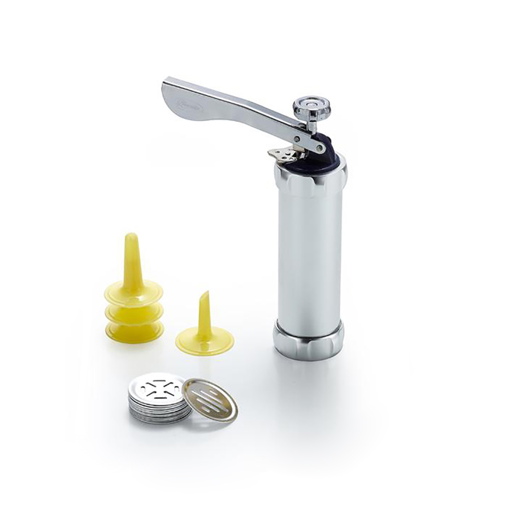The Shule Cookie Press is a pleasant, useful little gadget with 20 aluminum cookie dies and 4 decorating nozzles. It can make twenty types of cookies with the most original forms and can be used directly on the baking tray. With the help of four nozzles, it becomes a handy syringe for decorating cakes.