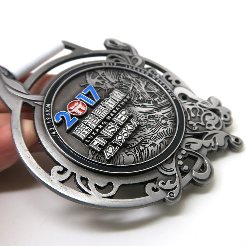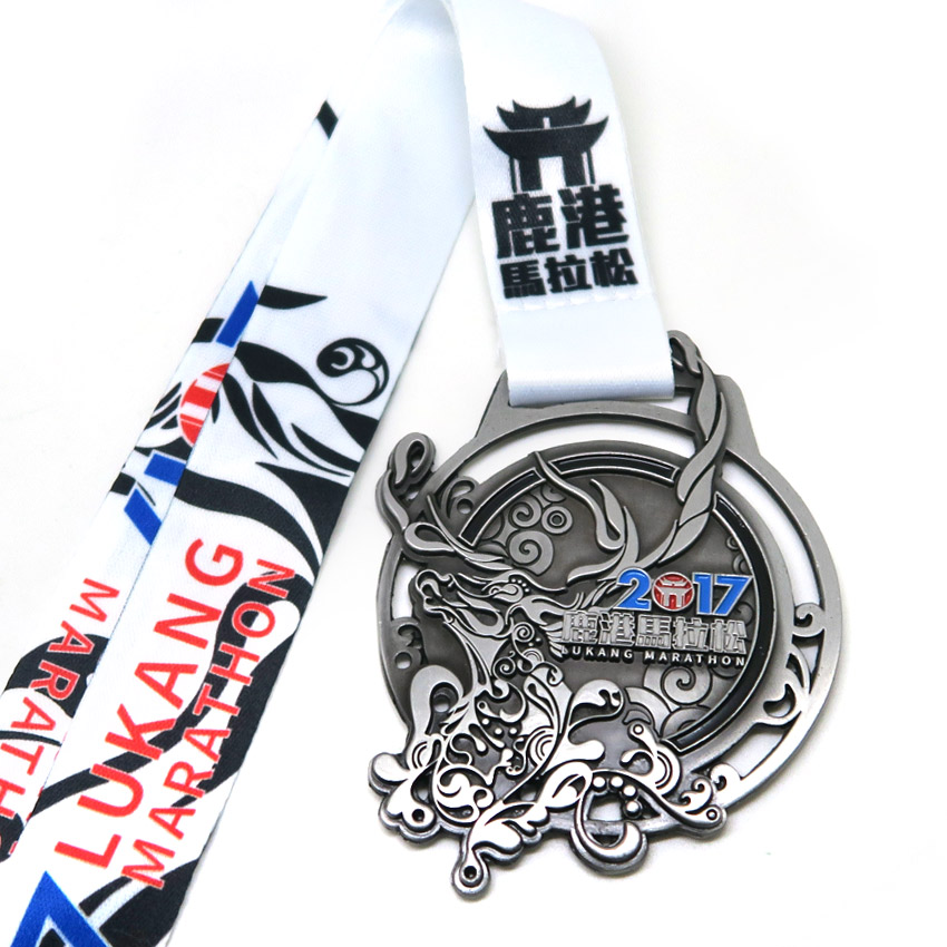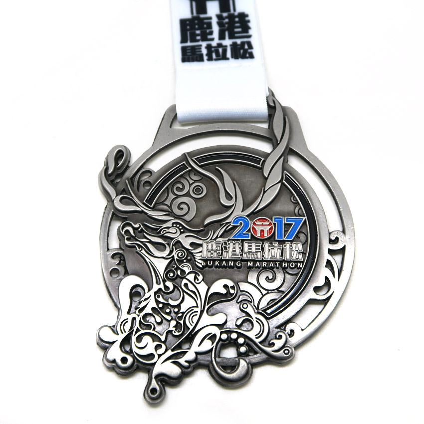 The feature of this Lukang marathon event is that runners can run through ancient and modern by the scenery along the way. Therefore, this silver antique medal reveals its historical and tradition by designed with a Chinese dragon on it.