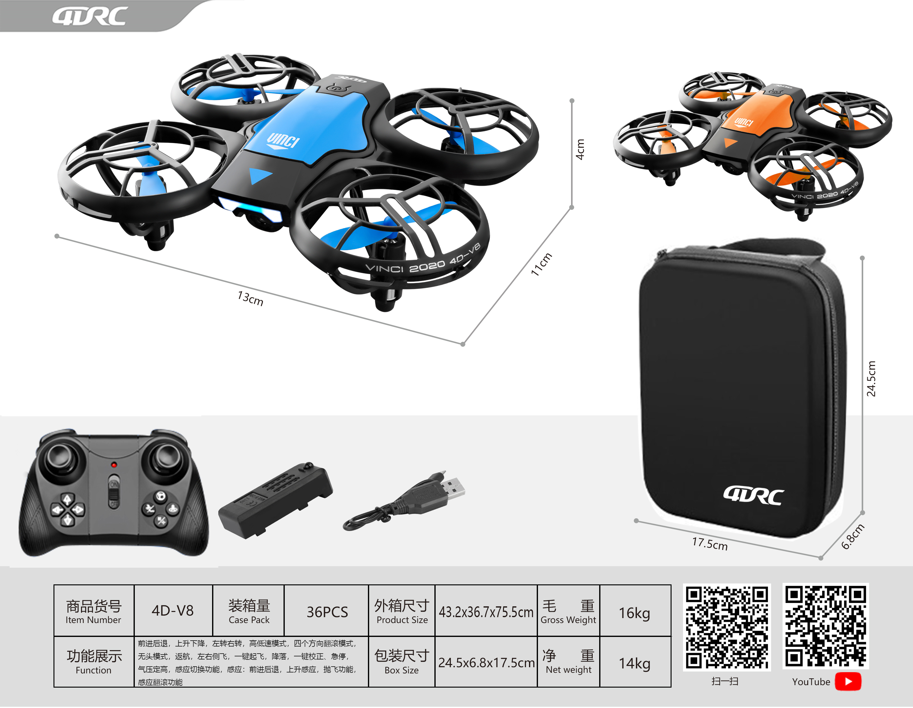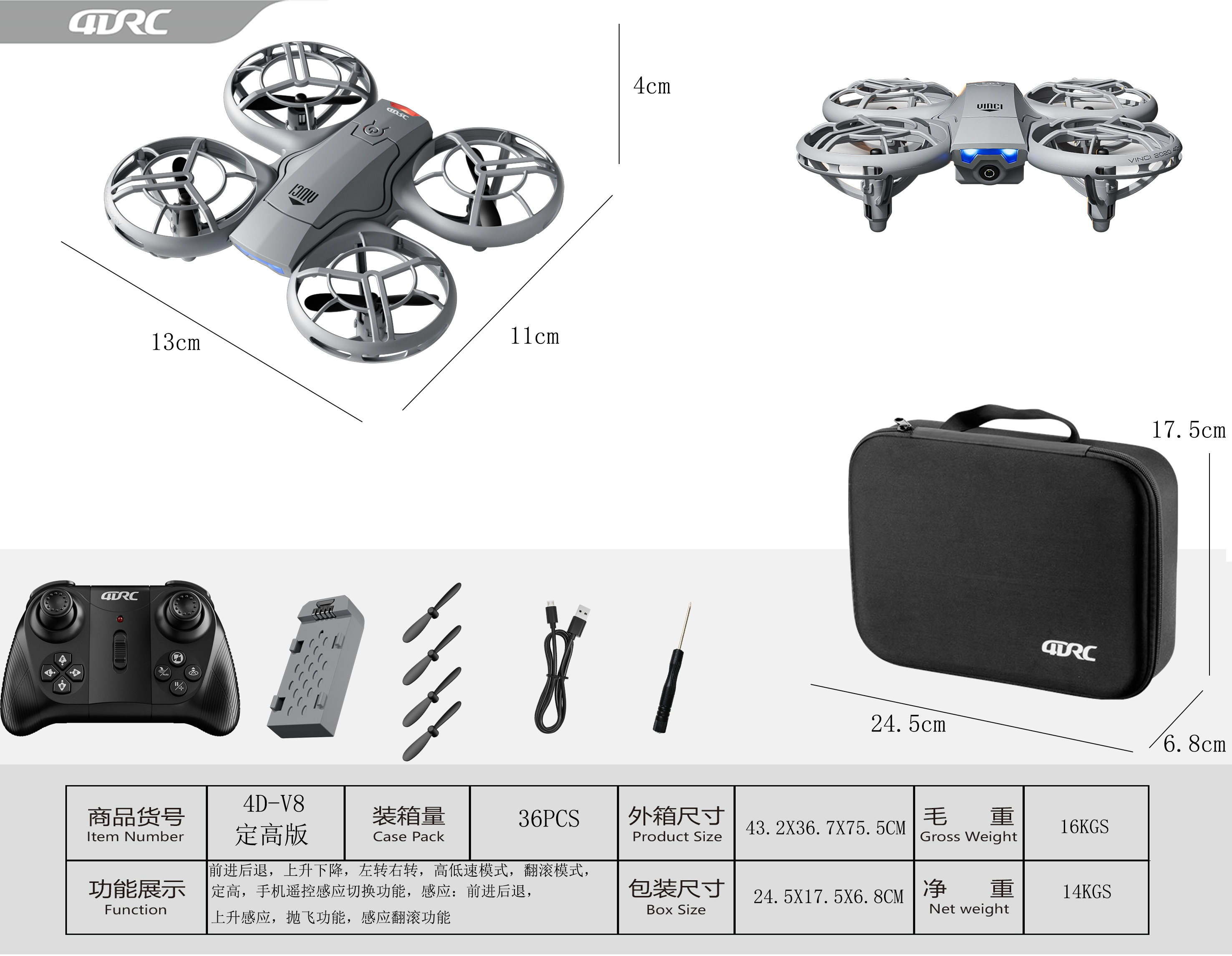 Fixed height without camera version: forward and backward,up and down,turn left,turn right,high and low speed mode,four direction roll mode,headless mode,return bome,left and right side flying,one key take off,landing,one key calibration,emergency stop,altitude hold,induction switch function,throw to fly.
