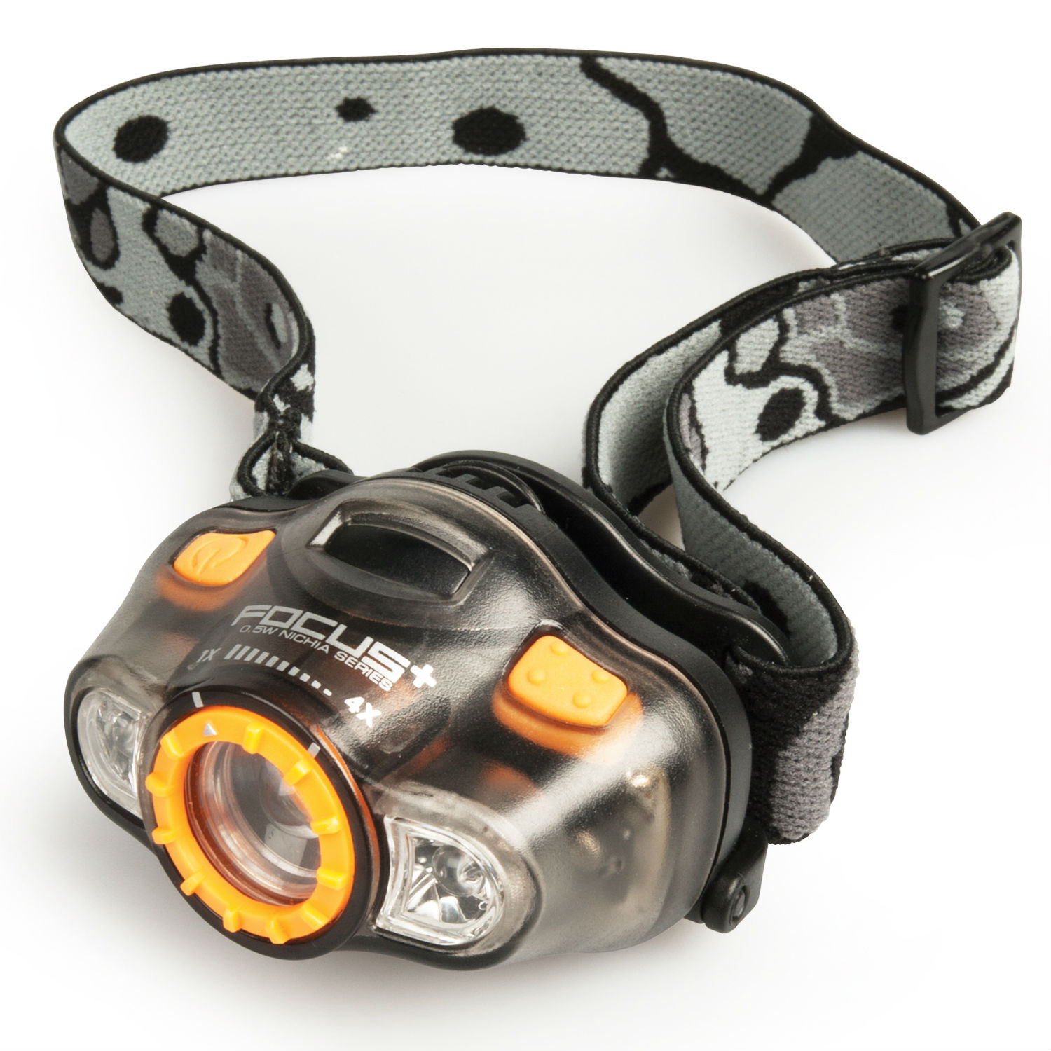 Tri Colour LED Headlight This torch offers unparalleled functionality in low light situations. Featuring 3 separate coloured LEDs tailored for specific tasks. The white 0.5W Nichia LED is ideal for general tasks, the red LED offers improved night vision and the green LED makes map reading at night easier on the eyes. The innovative focus control system allows the user to adjust focus from 1X Flood to 4X Spot beam quickly with a twist of focal ring.