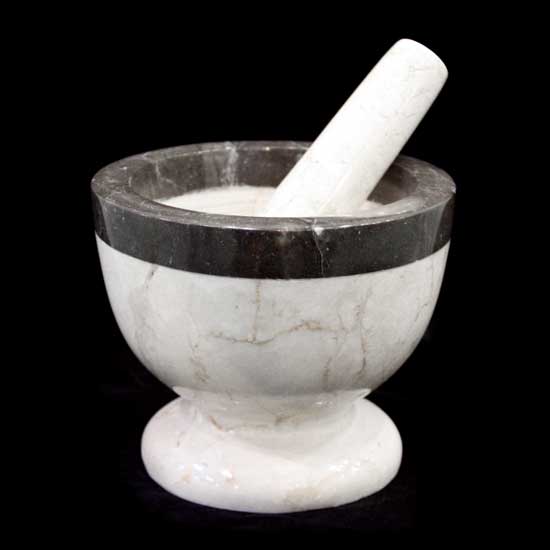 This alluring mortar and pestle set is constructed from natural marble in a champagne color. The heavy-duty mortar is highlighted with a dark brim. This practical mortar and pestle set is ideal for grinding use.
