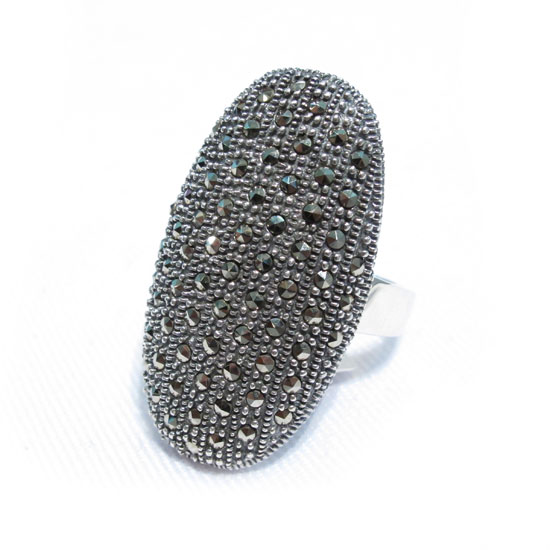This marcasite silver is designed in an elongated oval shape with scattered gemstones. The simplistic, monotone design exhibits subtle charm that appeals to many. This stylish gemstone ring is an interesting addition to your collection of accessories.