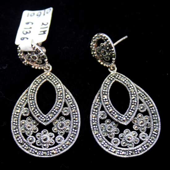 The Victorian-style marcasite drop earrings depict pear-shaped pendants with marcasite stones. The faceted marcasite stones shimmer against the carved sterling silver setting. Look gorgeous with this pair of compelling marcasite earrings.