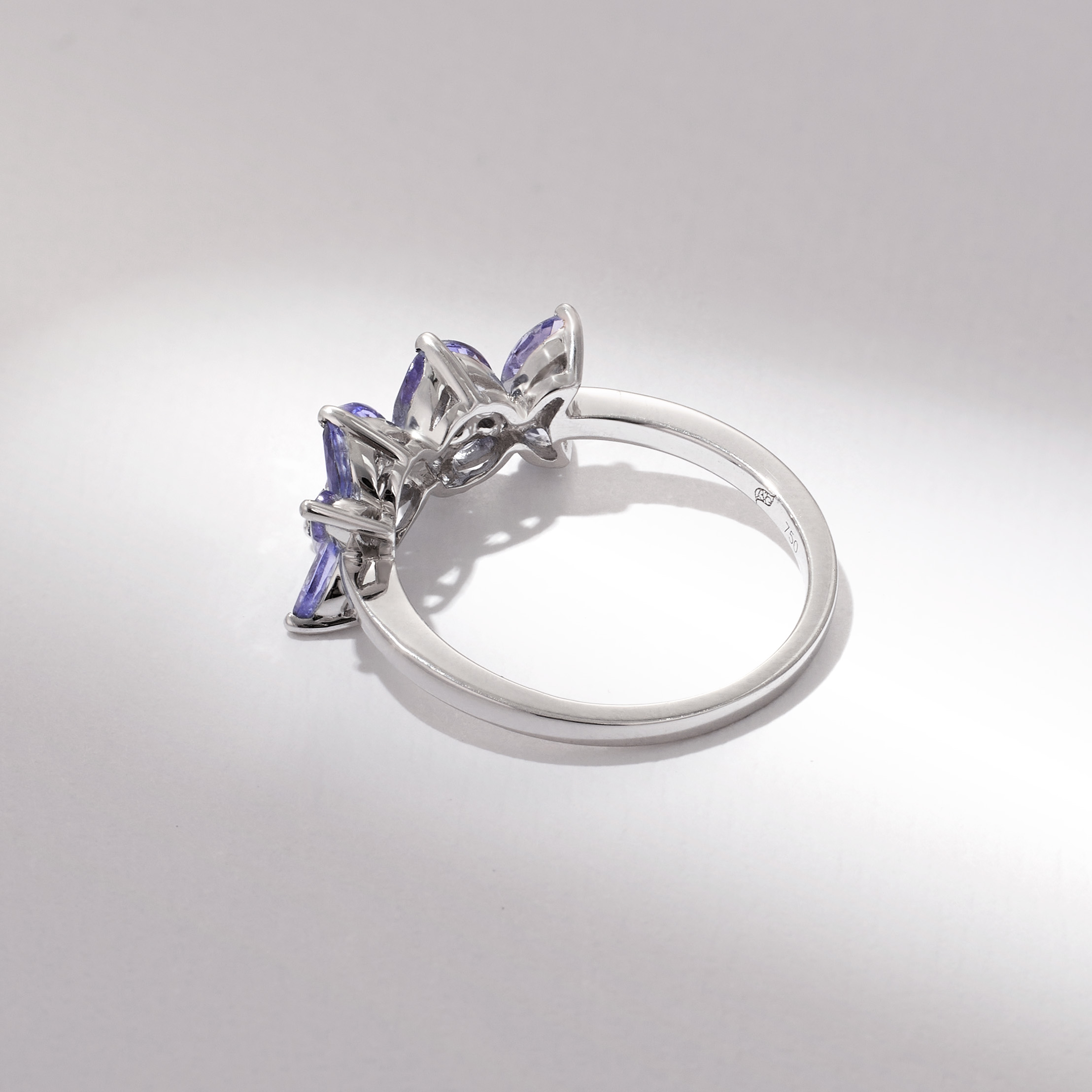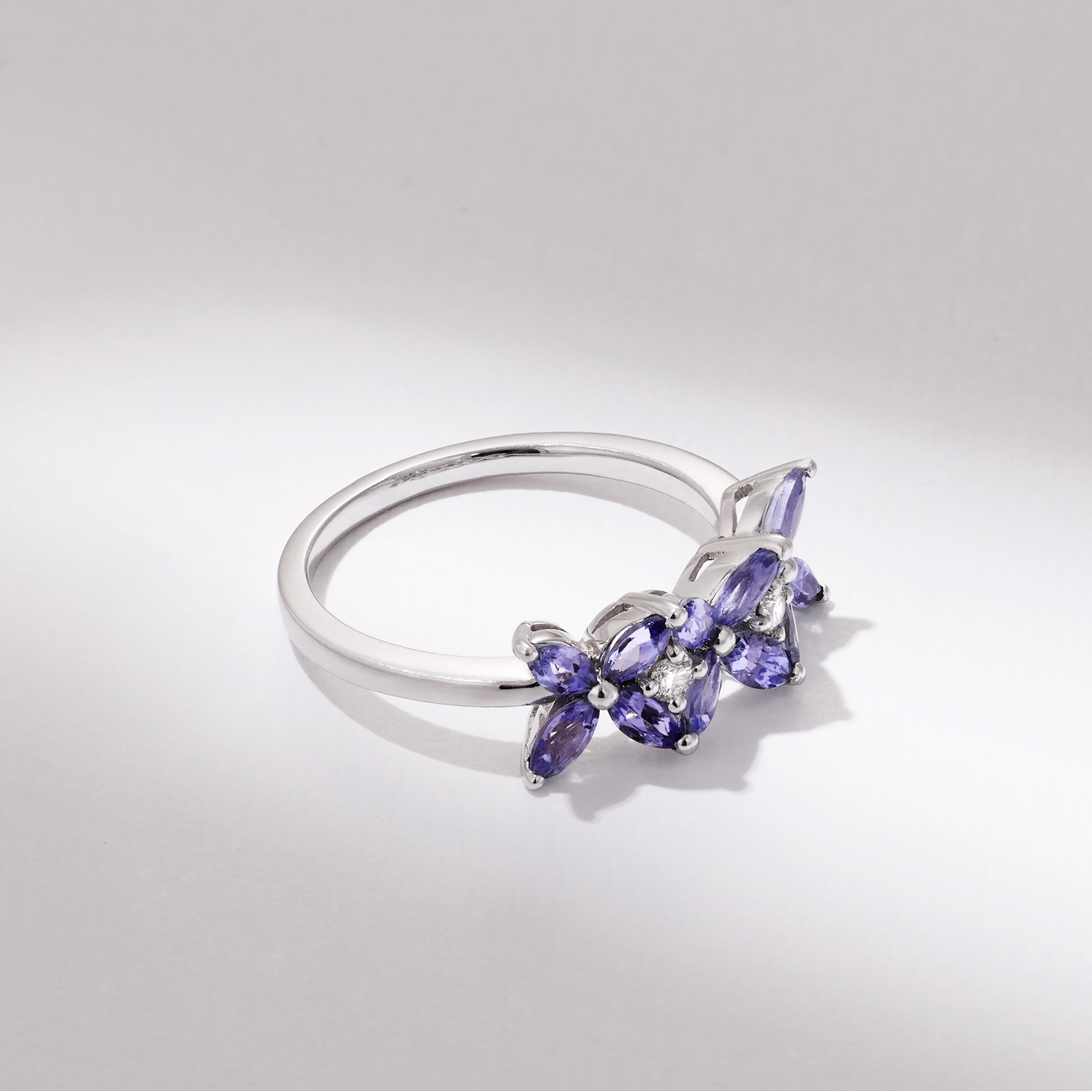 This 18K white gold ring designs made up of twelve marquise-cut Lavender Tanzanites, creating a beautiful effect. Two round-cut diamonds add elegance and sparkle brilliantly in the light, contrasting against the lavender tanzanites.