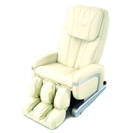 This is a white massage chair with various massage functions. There are air bag pressing and vibration functions at different areas of the seat. This massage chair is designed with various manual massage settings for the whole body.