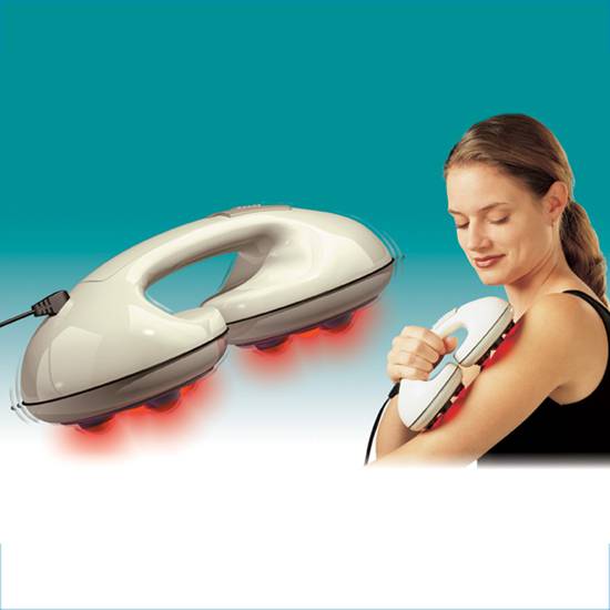 As shown is a massager with the dual infrared heating function. The massager comes with a car cigarette plug and an adaptor. The massager can be applied to all body parts like one's neck, waist and thigh.
