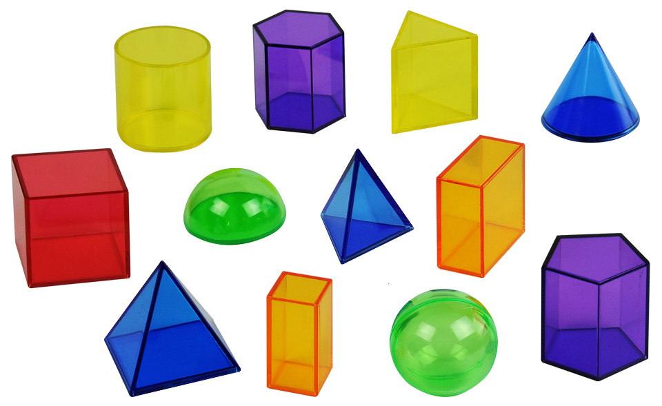 These 12 big bright shapes have a common 10cm dimension to illustrate relations between area, volume, shape, form and size. It helps to develop skills in recognizing shapes, naming shapes, comparing shapes, composing shapes and drawing shapes. Students can get a solid grasp of early geometry concepts by identifying and analyzing these 3D shapes. All made of tough and durable plastics, supplied in 6 bright colors.