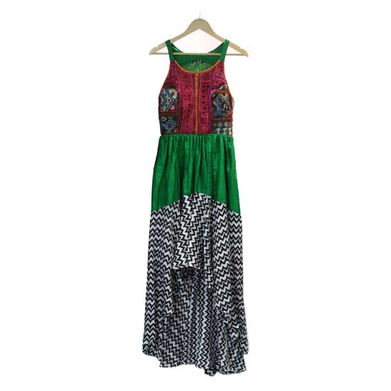 Featured here is a sleeveless maxi dress designed with a strong ethnic style. The fascinating embroidery patterns add sophisticated charm to this dress. The use of bold colors and print patterns highlight the adventurous and youthful character of the wearer.