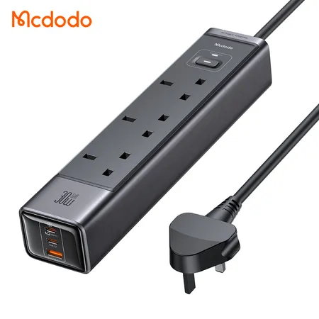 1.Power strip with 6 outputs including 2 USB-C ports, 1 USB-A port, and 3 AC outlets