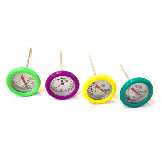 These meat thermometers are used to measure the internal temperature of meat, especially roasts, steaks and other cooked food. The instant-read thermometer consists of a pointed temperature probe and a dial. It can be repeated used for many times.