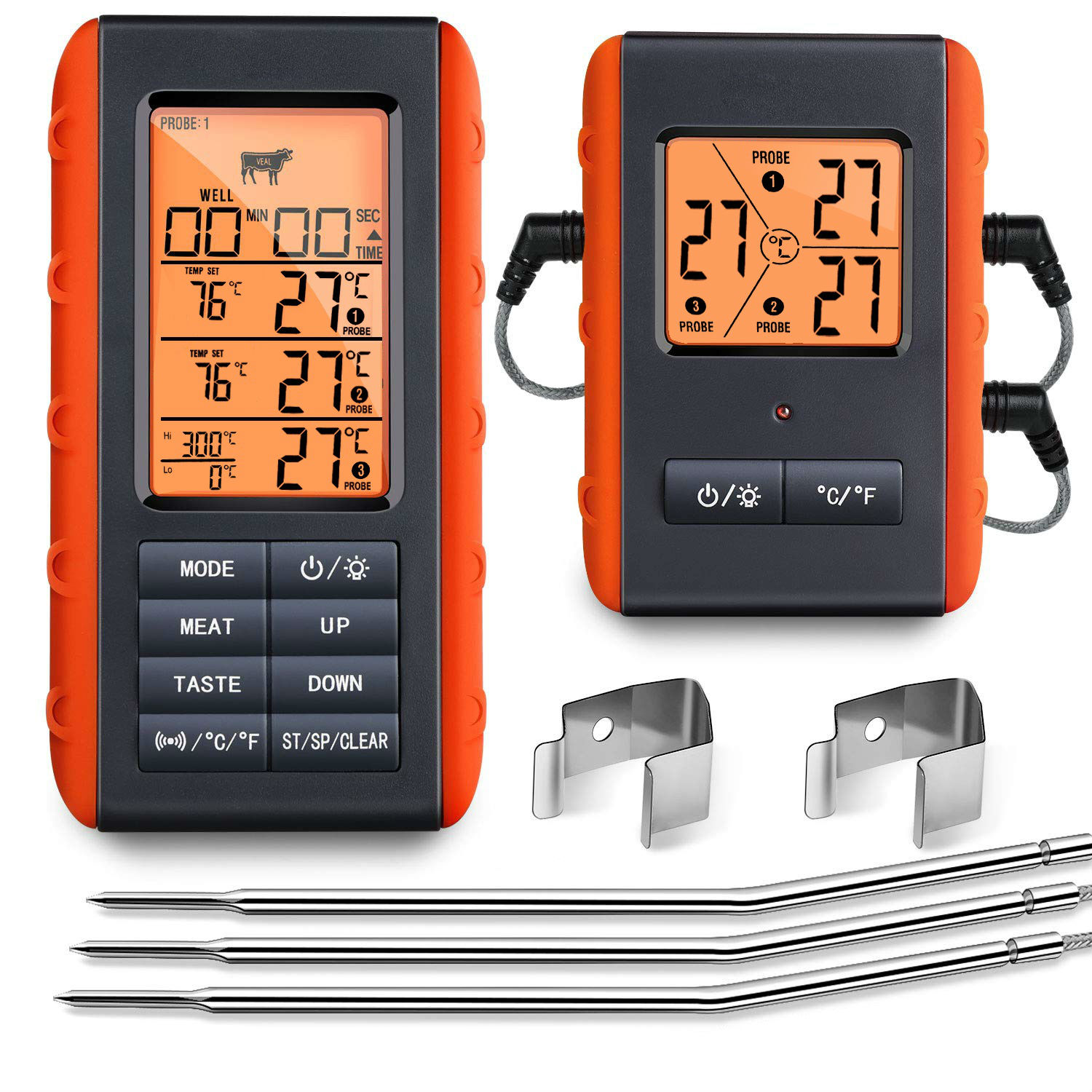 • ABS plastic + 304 stainless steel probe + TPE Four probes can work simultaneous With low temperature alarm beeps Pre-set target temperature, 8 different meats and 5 different tastes WITH USA, CHINA, EUROPEAN UNION PATENT CE, ROHS, FCC, LFGB, FDA,