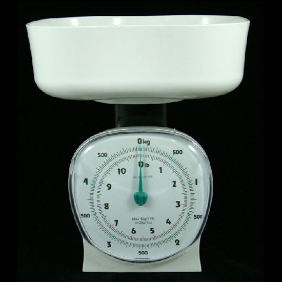 This is a mechanical kitchen scale with a durable structure. It features a big dial with exquisite markers. The bowl is made of food-grade plastic in white.