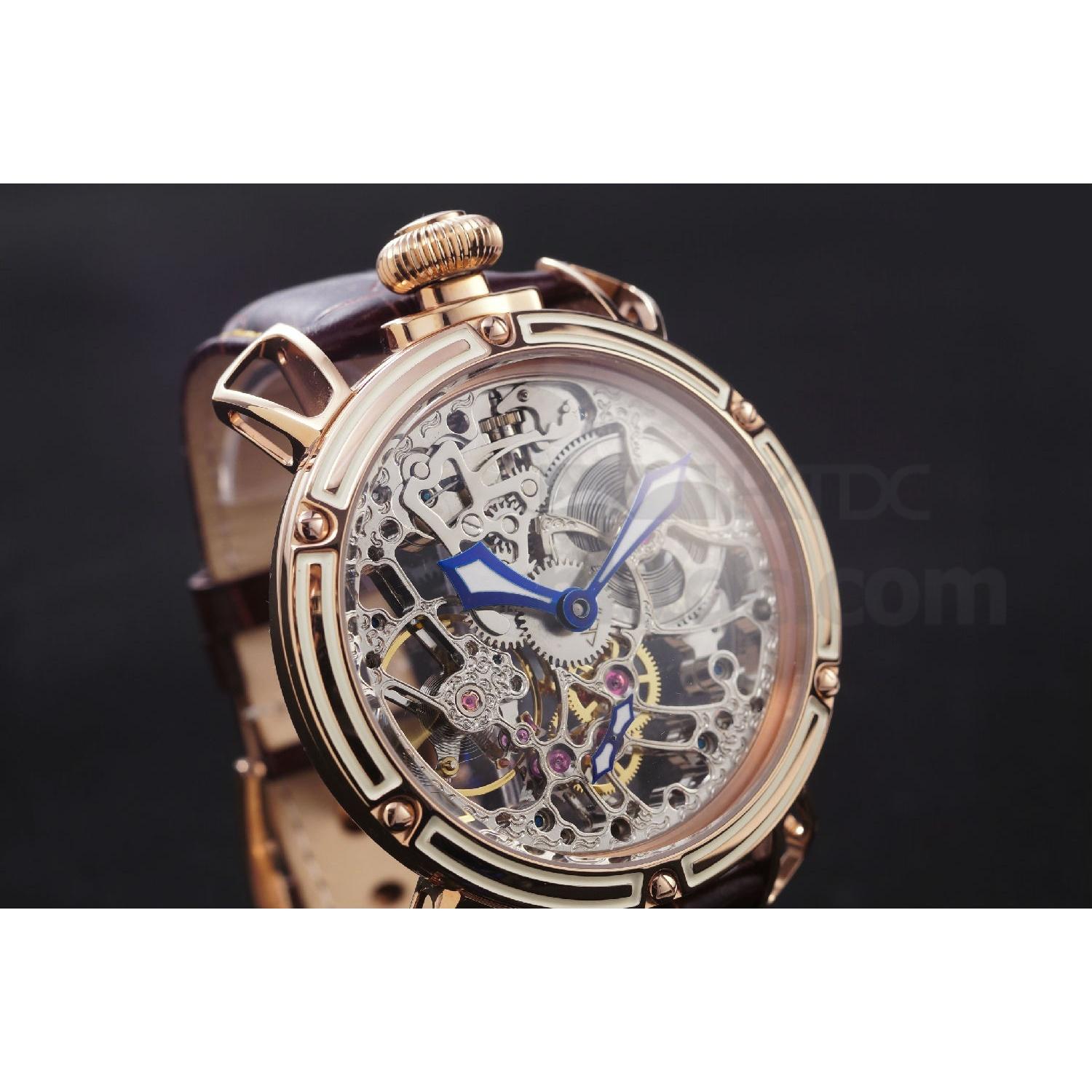 Handwinding mechanical movement with 17 pallet gems hollow casing. Engraved plate enhancing the perfect see-through perspective.