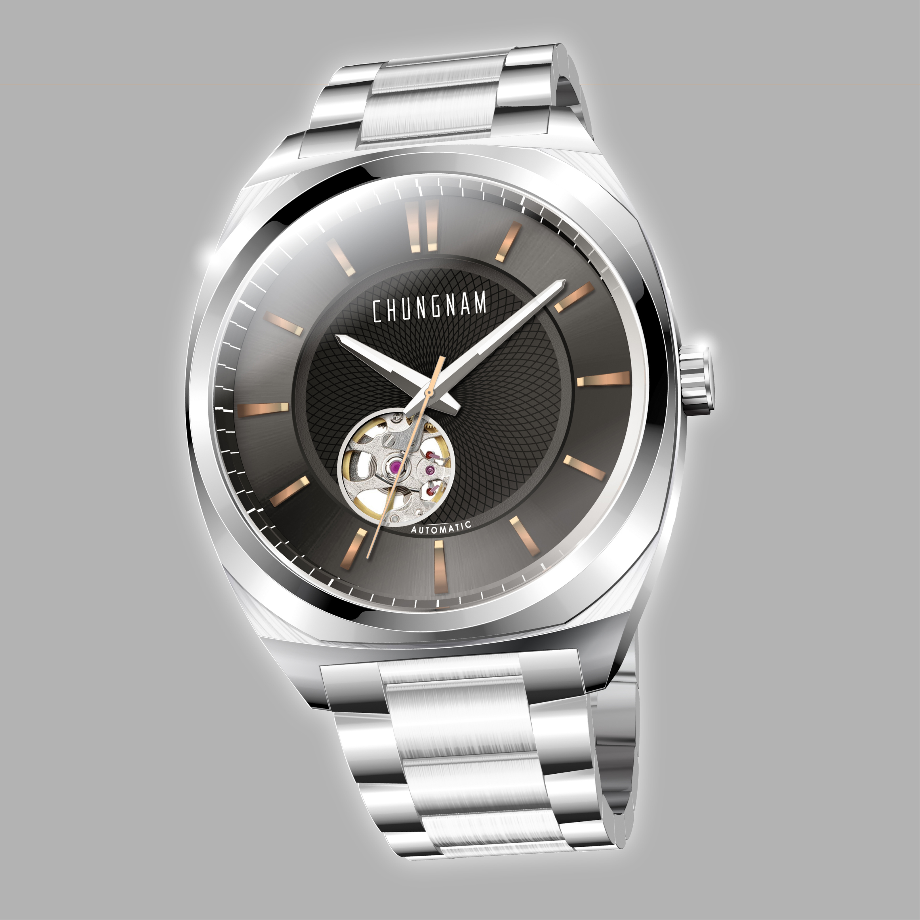 Japanese mechanical movement, 5 ATM water resistant, steel case and steel bracelet.