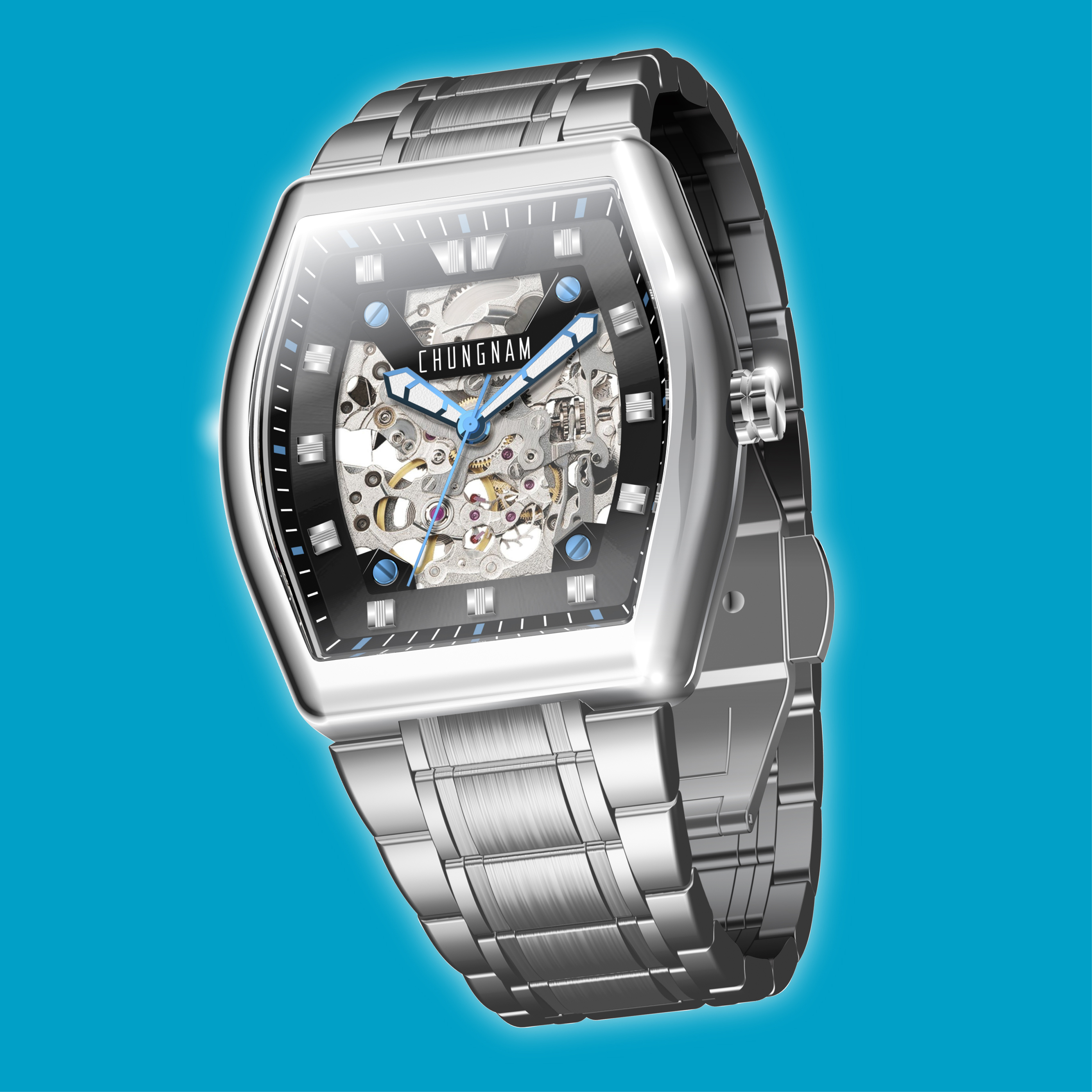 Japanese mechanical movement, 5 ATM water resistant, steel case and steel bracelet.