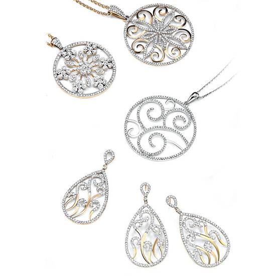 The featured diamond pendants are available in medallion shape and in open work design, as well as in round shape and teardrop shape. Featuring diamonds embellishing the edge and making patterns like flowers.