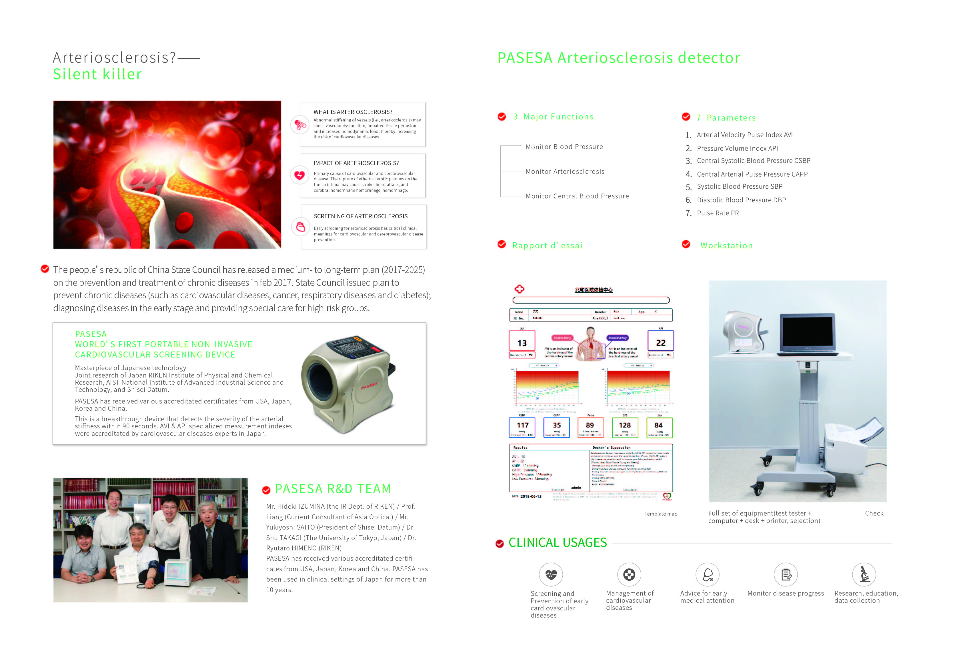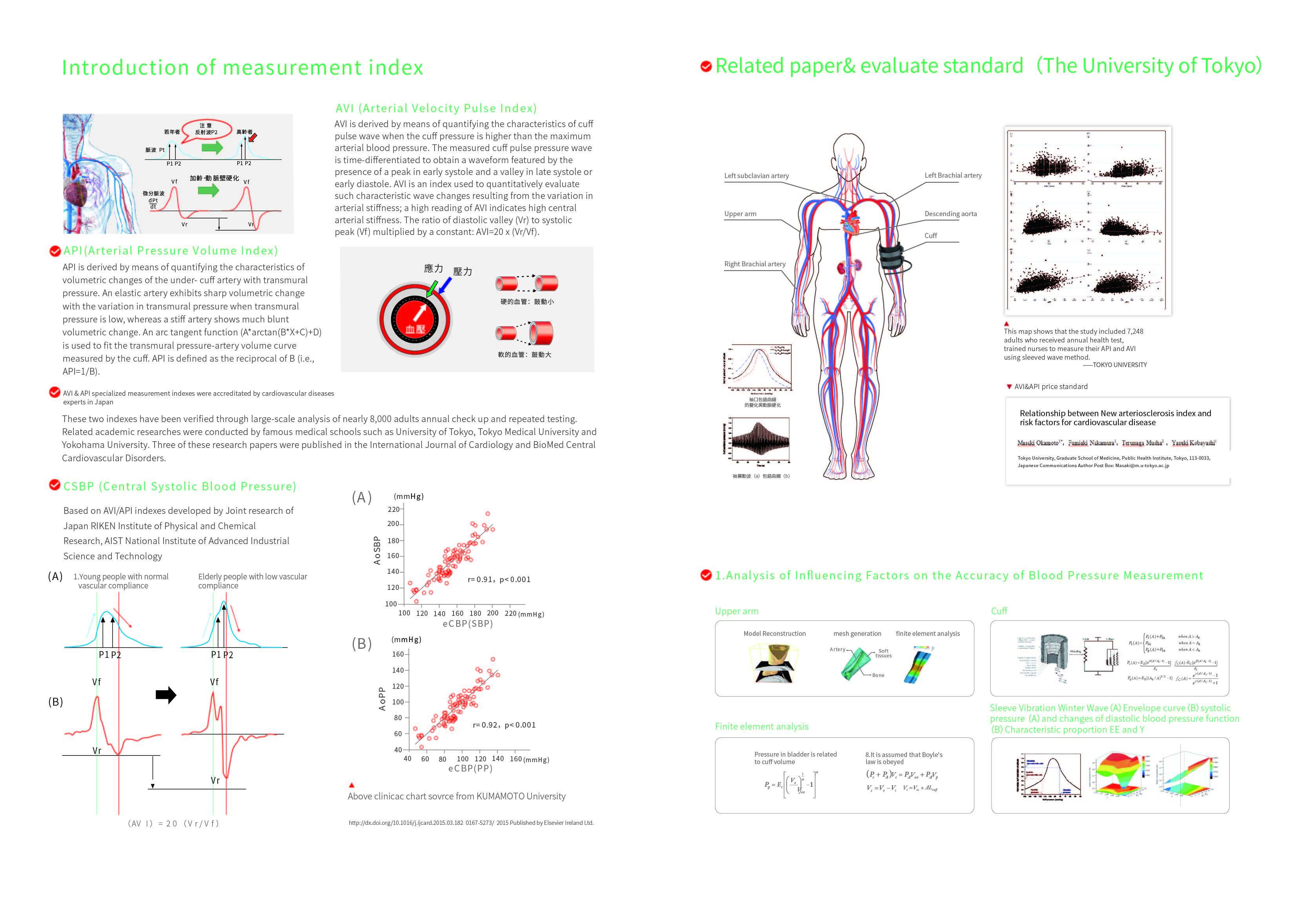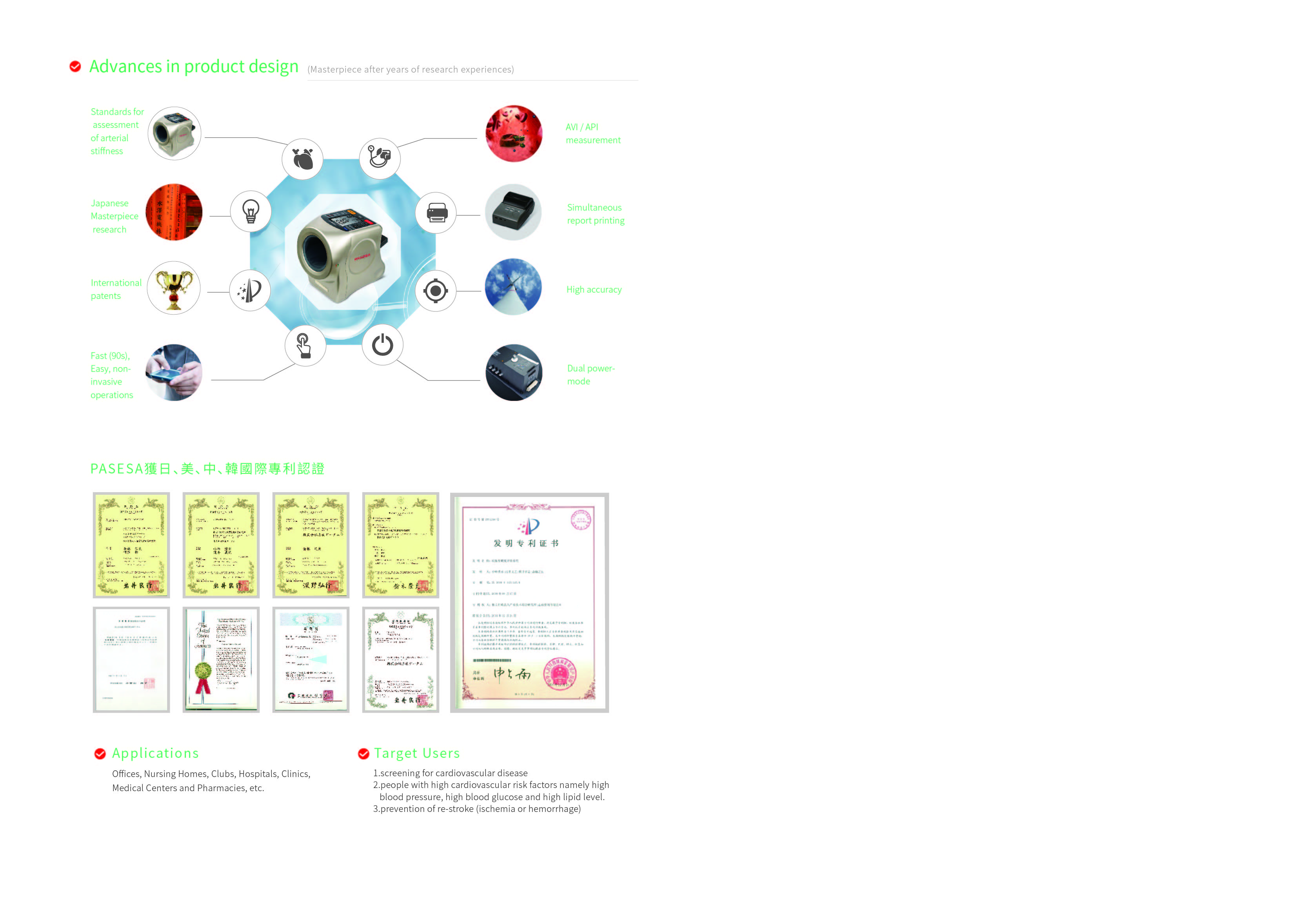 This is a breakthrough device that detects the severity of the arterial stiffness within 90 seconds. AVI & API specialized measurement indexes were accredited by cardiovascular diseases experts in Japan.