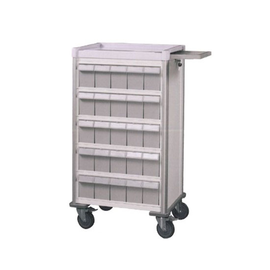 This is a medication-bin cart that features a robust frame for enhanced durability. It is fitted with different compartments and four wheels. This medication-bin cart offers a long service life.