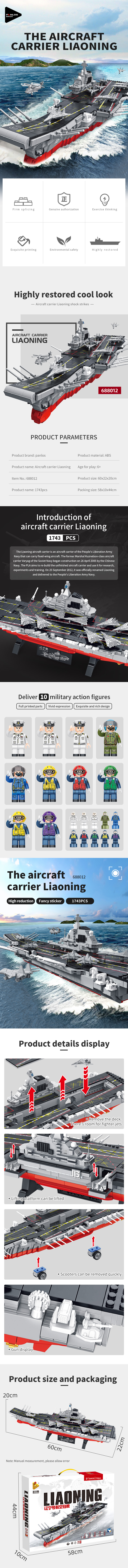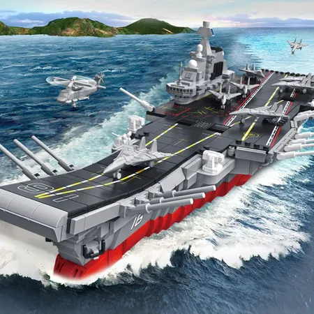 Medium-sized Liaoning aircraft carrier, with a beautiful design. It comes with 10 shipboard personnel building figures, 10 chessboard figures, 18 carrier aircraft, and 4 tow trucks.
