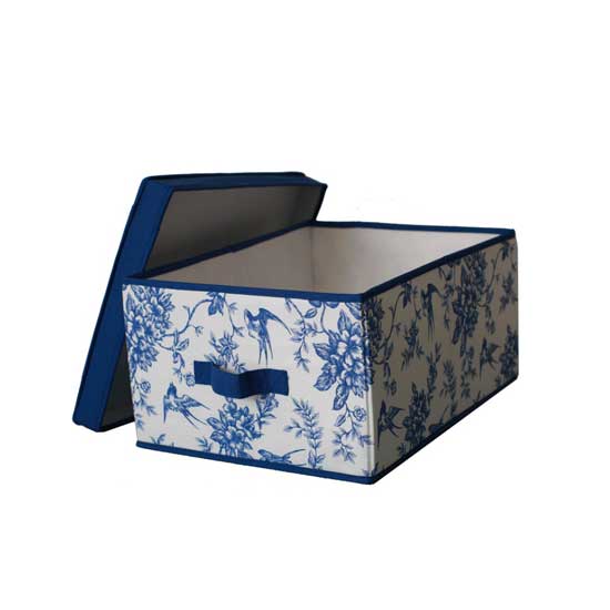 This medium sized box features blue flower and bird printings on the exterior. The box is wrapped with cotton-like fabric outside and inserted with PP boards. It offers a stylish storage solution for your home.