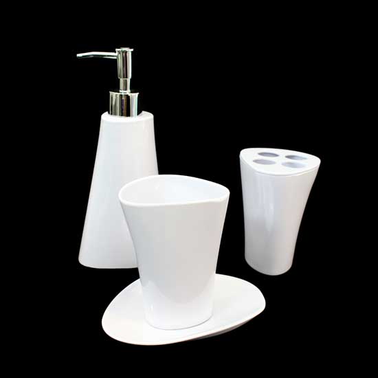 This four-piece melamine bathroom set includes a liquid soap dispenser, a tumbler, a toothbrush holder and a soap dish. The stylish melamine bathroom set features an elegant white design. The quality melamine set is biodegradable and easy to clean.