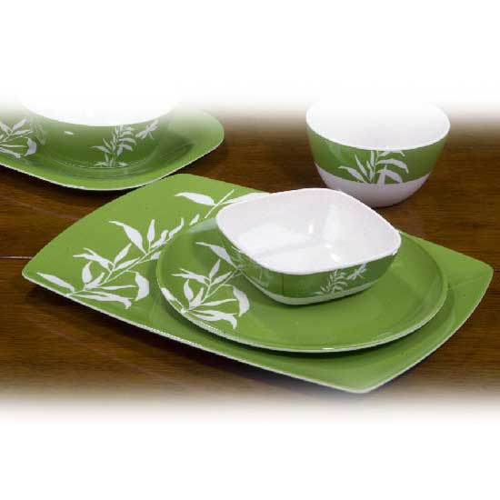 This pistachio green melamine dinnerware set features white leaf motifs with an elegant touch. It includes a salad plate, a dinner plate, a small bowl, a large bowl, a tray and other utensils. This stylish and practical dinnerware set is an ideal addition to your kitchen.