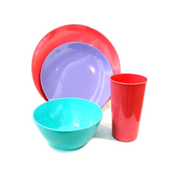 This four-piece tableware set includes a bowl, a tumbler and two plates in bright colors. The quality melamine tableware is shatterproof, biodegradable and easy to clean. The melamine tableware set is ideal for everyday use.