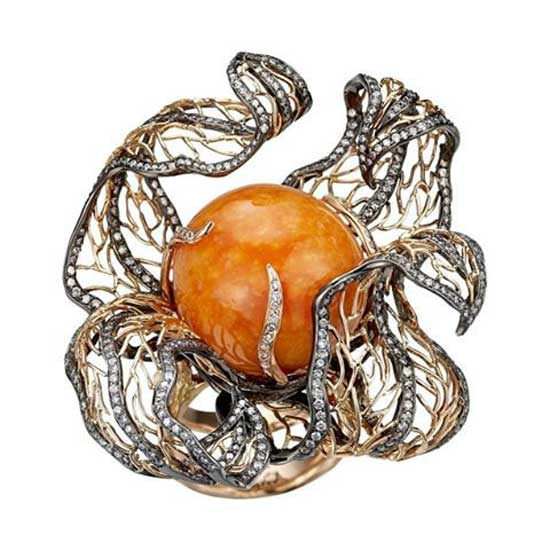 The ingenious design of this melo pearl jewelry is inspired by gooseberry, which enables it to be used either as a ring or as a pendant. The main gem is an extremely rare 46.91-carat orange melo pearl with a highly desirable trait of intense flame structure. This gorgeous melo pearl jewelry is a unique addition to your high-end jewelry collection.