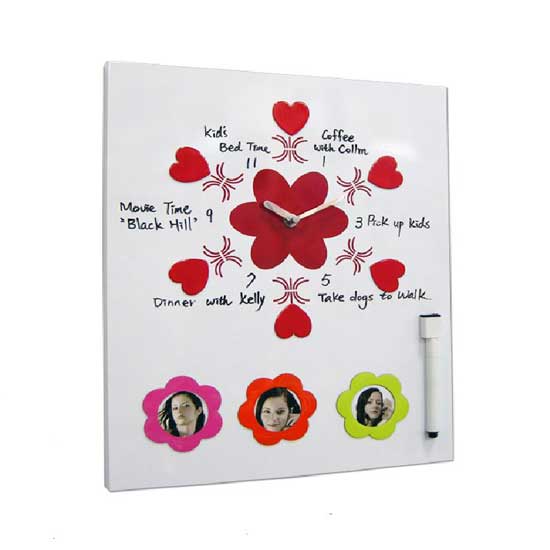 The memo board boasts metal construction for enhanced durability. It comes with six magnets, three photo frames and one marker. This innovative memo board is equipped with an analog movement for added functionality.