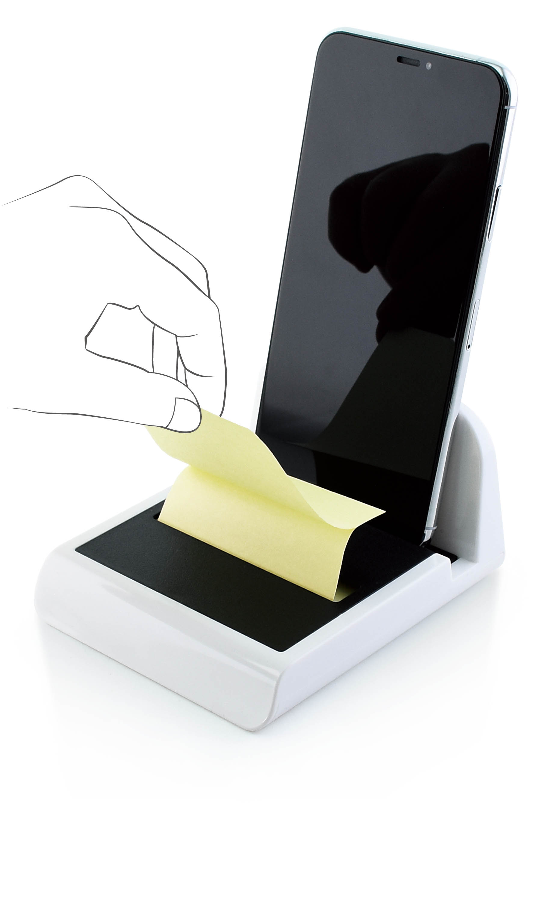 When you answer the mobile, can’t find the paper to write down the message? Here is the solution – our item S-335 – mobile stand with sticky notepad. It combines the functions of memo holder & mobile stand, with the charging cable hole for user to charge the mobile while rest on the stand. Besides, with the innovative adhesive tape on the bottom of the holder, user could get the note by one hand and remove the holder without mark on the table.