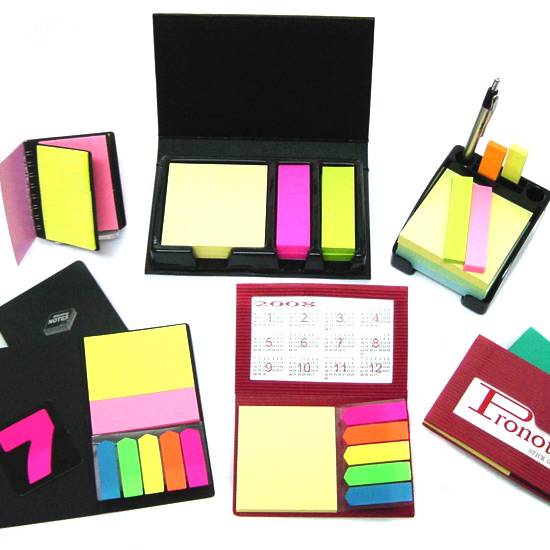 A set of self stick notes is packed in a blister card or gift box. It can come with a pen holder, calendar. It can be easily be removed.